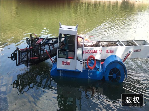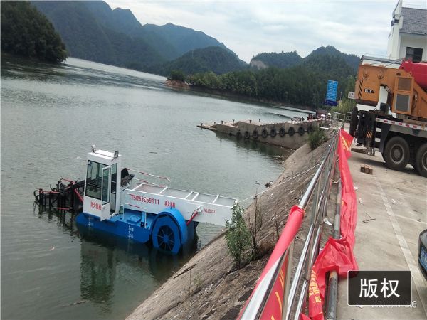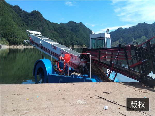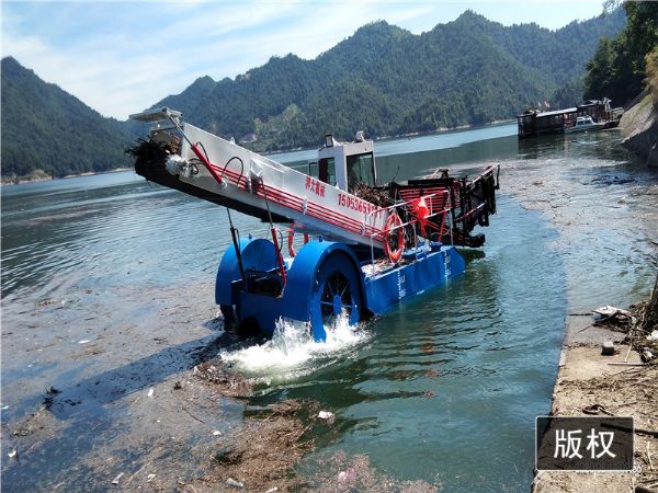 其功能:收割、聚拢、打捞、滤水、输送、卸载等于一体,所有操作程序采用全液压控制,简单、方便、灵活,是城市水面景区不可或缺的保洁设备,也可作为垃圾清理船、湖面保洁船均收到良好的效果。