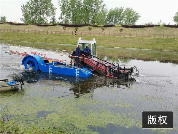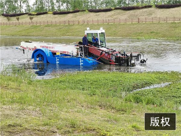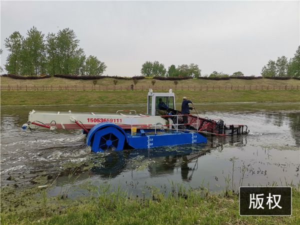 割草船, 是一种集割草、聚拢、打捞、滤水、输送、卸载等于一体的现代化水草、水葫芦收割设备。所有操作程序采用全液压控制,简单、方便、灵活,是城市水面景区不可或缺的保洁设备,也可作为垃圾清理船、湖面保洁船均收到良好的效果。