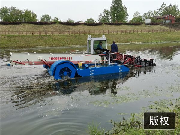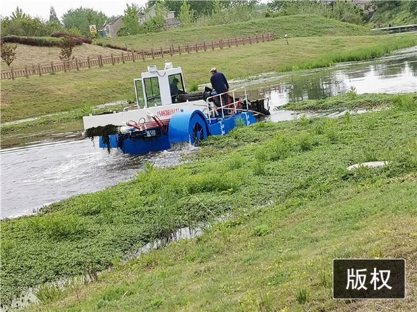 全自动水草收割船能收集湖面、河道、人工湖水域丛生的水草及水面漂浮物,机械联动采用全液压驱动,明轮、割台和输送链可连续工作,仅需一人操作全自动割草船装载量打,且在水域能够原地回转,大大减少了低头距离,并加装夜间作业照明系统,能配合紧急任务的夜间作业要求,仅需一人操作。