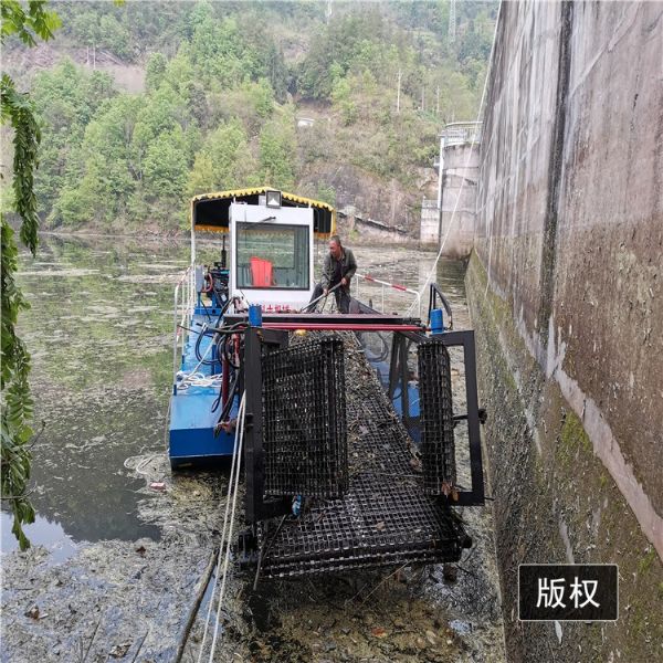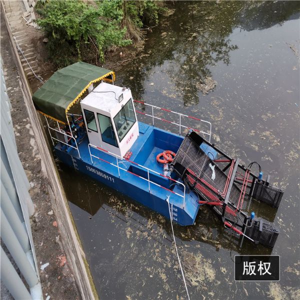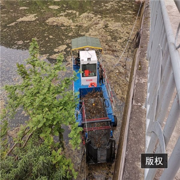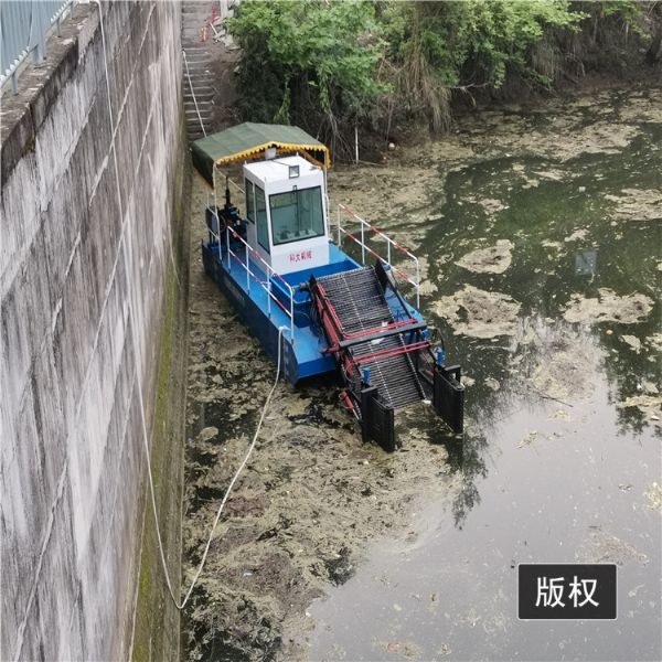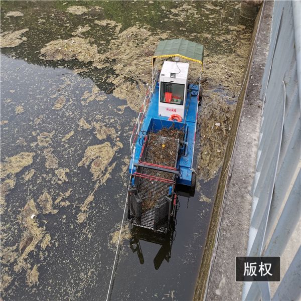 割草船,外型美观,体积小,适宜于风光区、湿地公园、小型湖泊、水上公园水面保洁。该船适用于水域内的水草、水葫芦和水面漂浮物废物的整理作业;船为单机、双明轮液压推动、全液压主动水面清洗设备。前收集舱经液压顶升装置,可上下动作,根据水深调节收集深,前收集舱均采用不锈钢收集带输送;聚拢、打捞、滤水自动化,卸载须人工辅助一下。