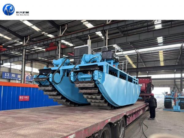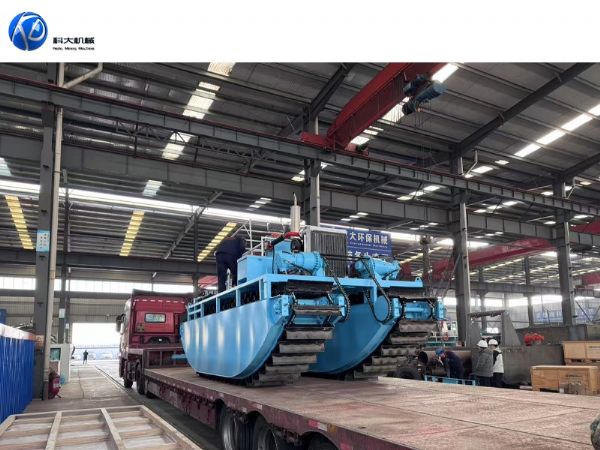 水陆两栖割草船装车发哈萨克斯坦,水陆两栖割草船也叫做两栖式多功能船,该船采用浮箱履带式试机,既可以在陆地上行走,又能在水上工作,配有挖斗、割草斗、收集耙、T型割等工作单元,可以完成挖掘、收割、排泥、清理杂草垃圾等工作。
