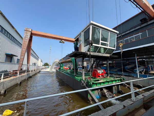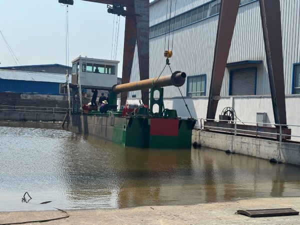 4000方流量绞吸式挖泥船公司内试机 18寸绞吸式挖泥船运输尺寸37米,下抽深度15米,每小时清水流量4000方,装船功率1500千瓦,用于河道、港口、码头、水库清淤抽沙。