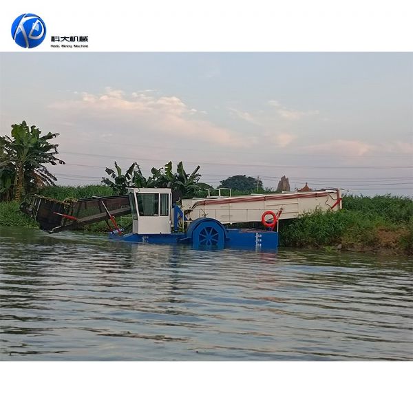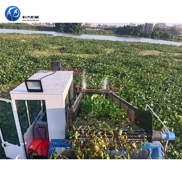 水葫芦打捞船在广东工作现场;打捞船适用于中小型湖泊、河道、人工湖等城市园林景区,可以有效的收割收集水中泛滥的水草、水葫芦、水浮莲、水花生、芦苇、水面漂浮垃圾等品种。