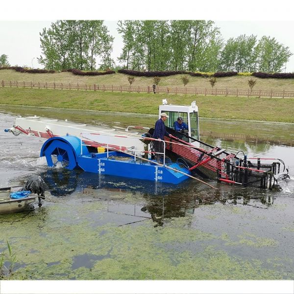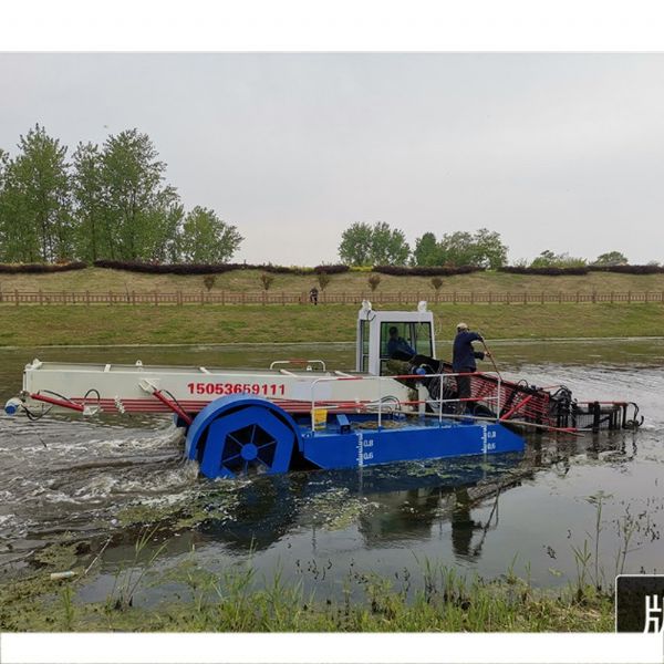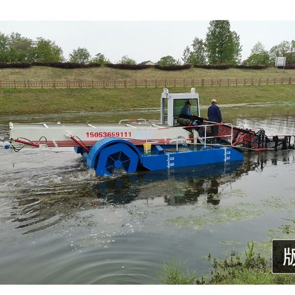 全自动割草船:全自动水草收割船能0的收集湖面、河道、人工湖水域丛生的水草及水面漂浮物,所有机械联动采用全液压驱动,明轮、割台、割刀和输送链可连续工作,仅需一人操作全自动割草船装载量打,且在水域能够原地回转,大大减少了低头距离,并加装夜间作业照明系统,能配合紧急任务的夜间作业要求,仅需一人操作。电话:186-1590-8621