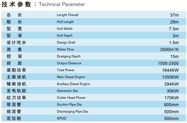 是在疏滩工程中运用较广泛的一种船舶,它是利用吸水管前端围绕吸水管装设旋转绞头装置,将河底泥沙进行切割和搅动,再经吸泥管将绞起的泥沙物料,借助强大的泵力,输送到泥沙物料堆积场,它的挖泥、运泥、卸泥等工作过程,可以一次连续完成,它是一种效率高、成本较低的挖泥船,是良好的水下挖掘机械。